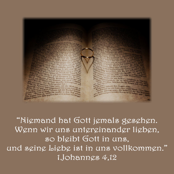 Heiraten und Hochzeit – Bibelvers der Woche – 1.Joh. 4,12 Veröffentlicht am 16. August 201525. August 2015 von barockengel61 Bild Pixabay Teilen mit: Auf X teilen (Wird in neuem Fenster geöffnet) X Auf Facebook teilen (Wird in neuem Fenster geöffnet) Facebook Gefällt mir Wird geladen …